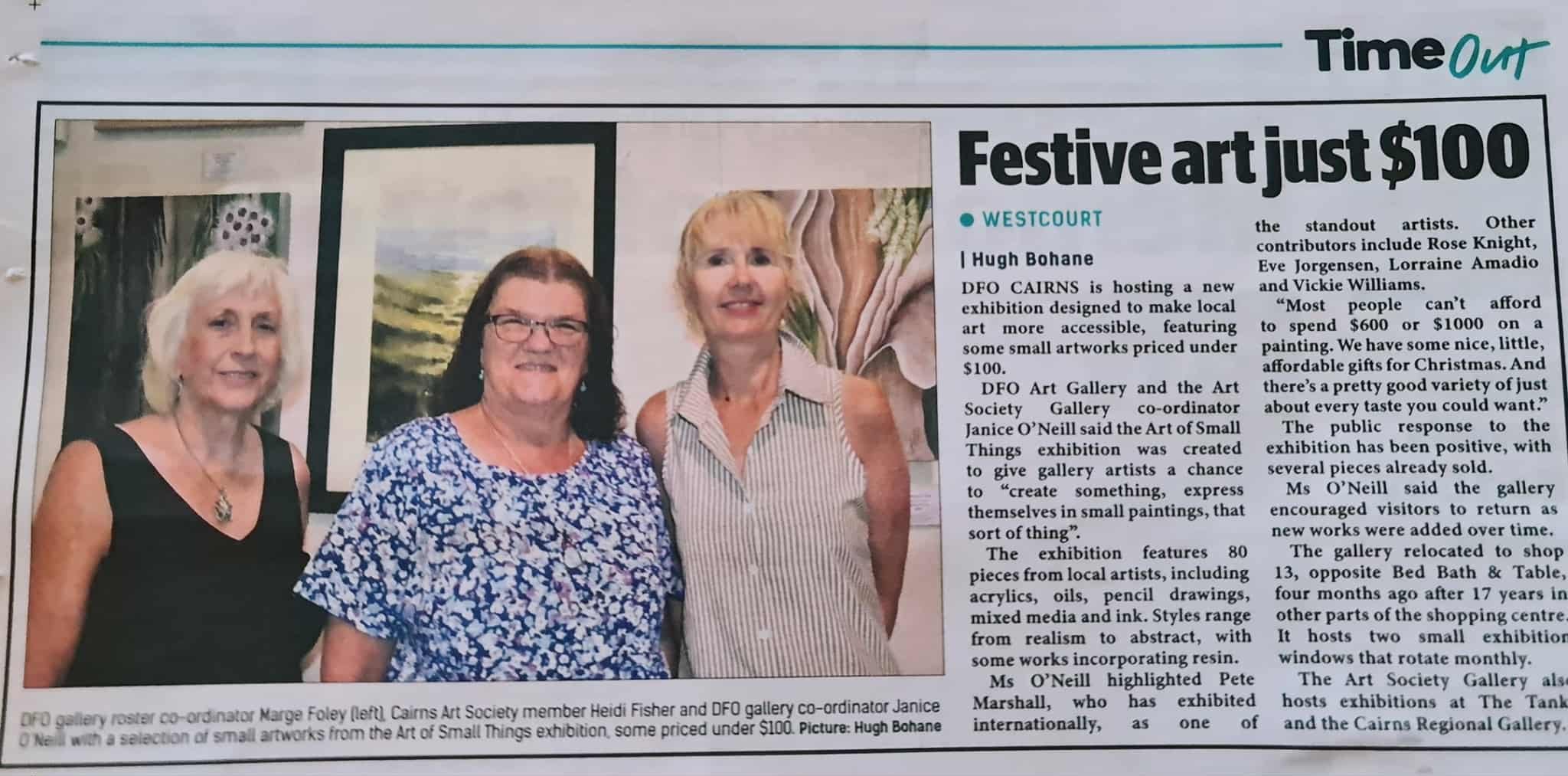 The Cairns Art Society Gallery at DFO is Located (Next to bed, Bath and Table) at the DFO Shopping centre Shop 31, 274 Mulgrave Road, westcourt. This thriving gallery is a traditional exhibition space for all C.A.S members.